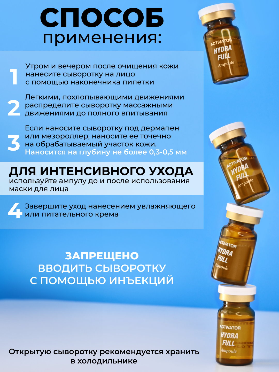 После использования тоника утром и вечером нанесите необходимое количество на все лицо и аккуратно сделайте так, чтобы она впиталась.Для интенсивного ухода применяйте эту ампулу до и после использования маски для лица.