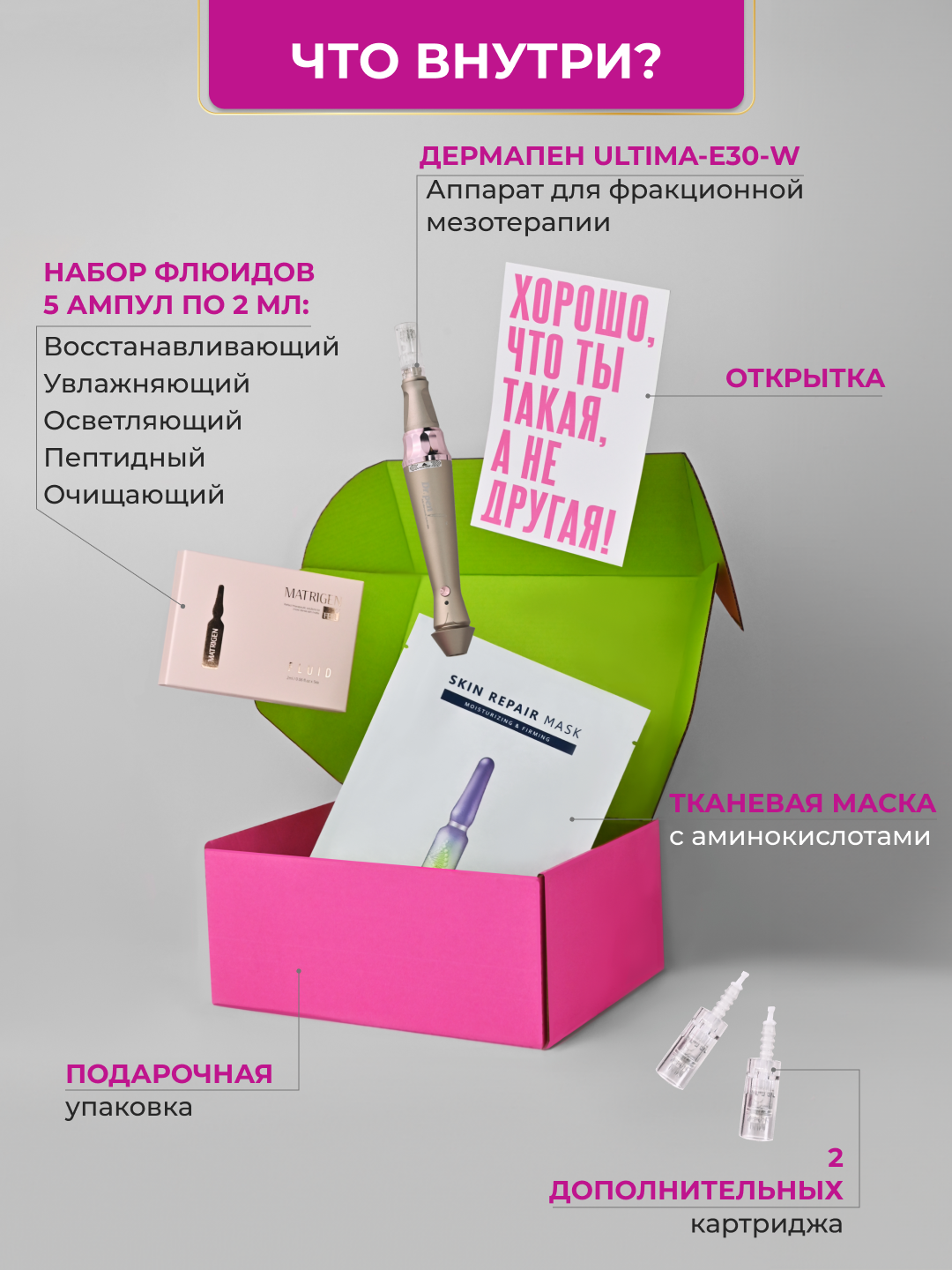Набор для знакомства с ампульными сыворотками от бренда Matrigen. В состав входят по 1 ампуле увлажняющая сыворотка для лица, осветляющая сыворотка для лица, пептидная сыворотка для лица, очищающая сыворотка для лица и восстанавливающая сыворотка для лица. Подробнее о товаре здесь4) Matrigen Repair Mask Тканевая маска для восстановления кожи, 1 шт. *