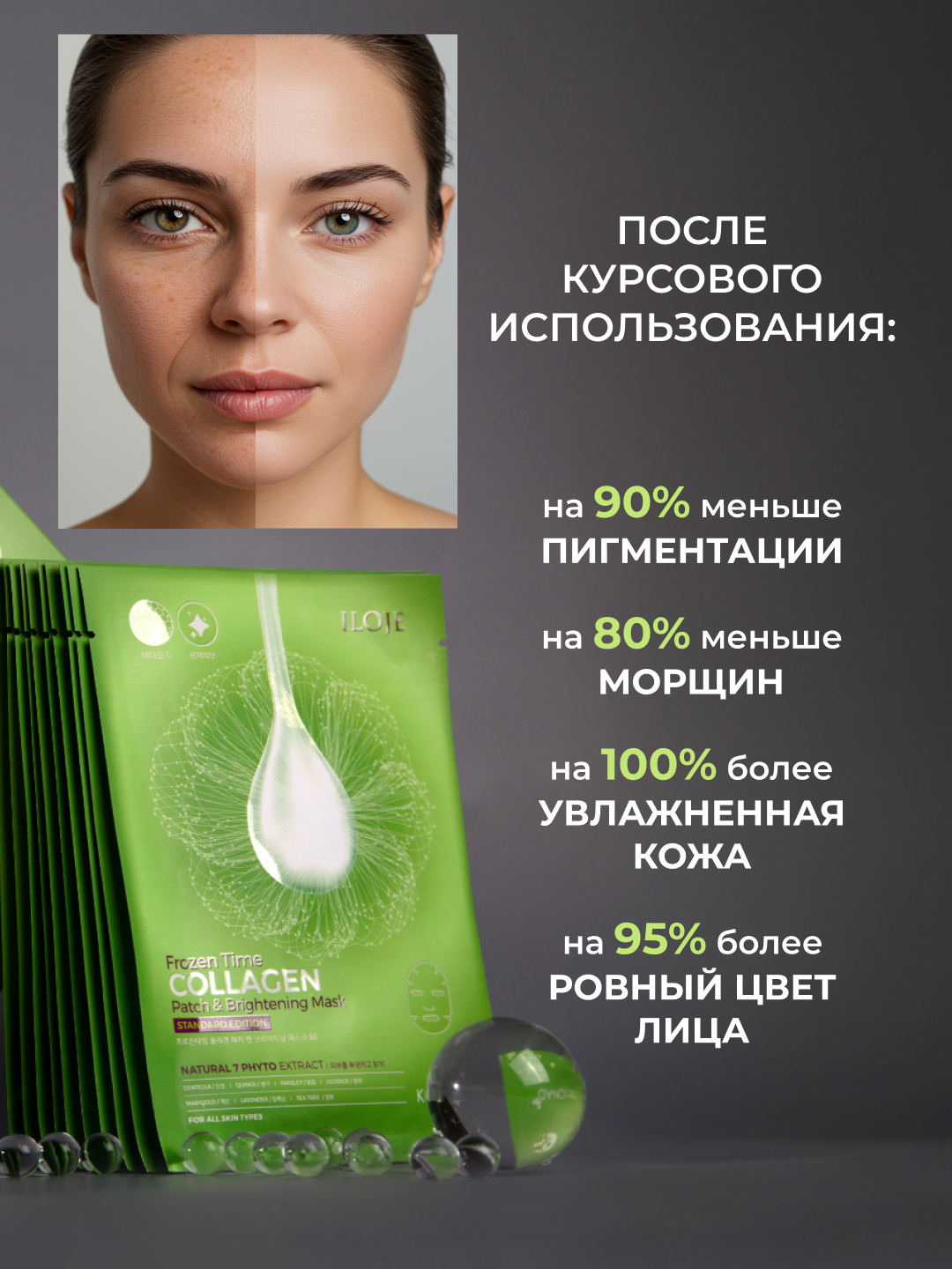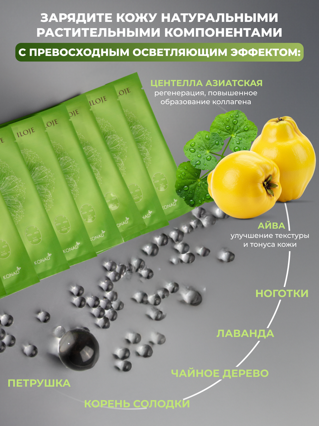 Если вы хотите вернуть коже яркий тон, зарядите ее натуральными растительными ингредиентами с превосходным осветляющим эффектом! То вам на помощь придут такие компоненты маски, как:- Центелла азиатская - заживление ран, повышенное образование коллагена.