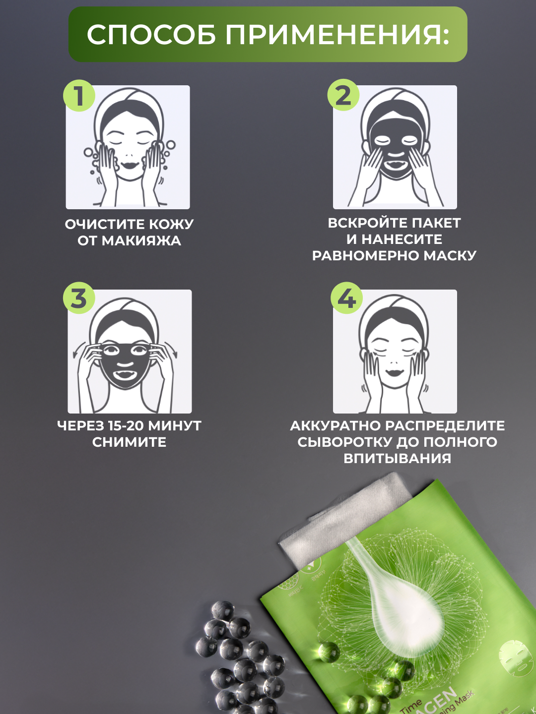 1. Очистите кожу лица пенкой или лосьоном.2. Вскройте упаковку и нанесите маску на лицо, равномерно распределив ее по коже.
