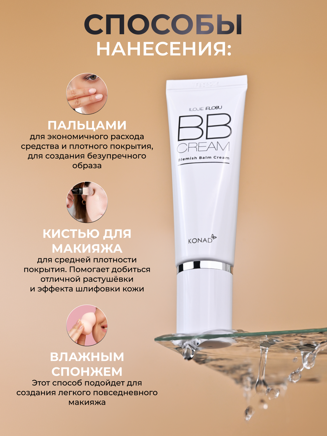 как правильно наносить ВВ крем Konad? Наносить ББ крем лучше всего на чистое лицо (если кожа не склонна к сильной сухости или жирности), если необходимо нанести уходовое средство для кожи, сделайте это заранее, за 20-30 минут, чтобы кожа впитала его и ВВ крем мог лечь аккуратно.Есть несколько способов нанесения ВВ крема Konad: с помощью пальцев, кистью, спонжем.