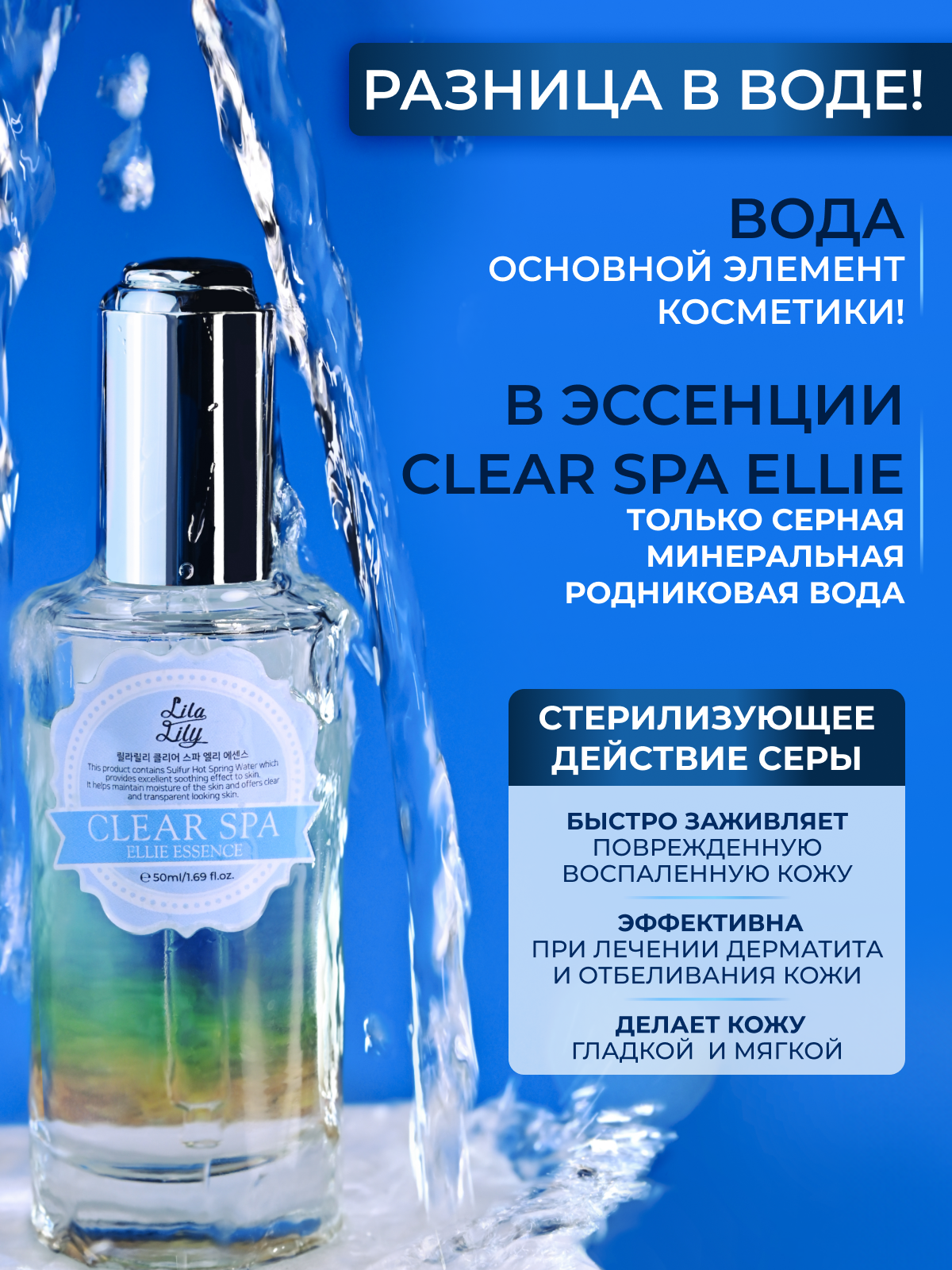 Вода - самый основной элемент косметики! Clear Spa Ellie Essence основана только на серной воде, не включая ни капли обычной (очищенной) воды.