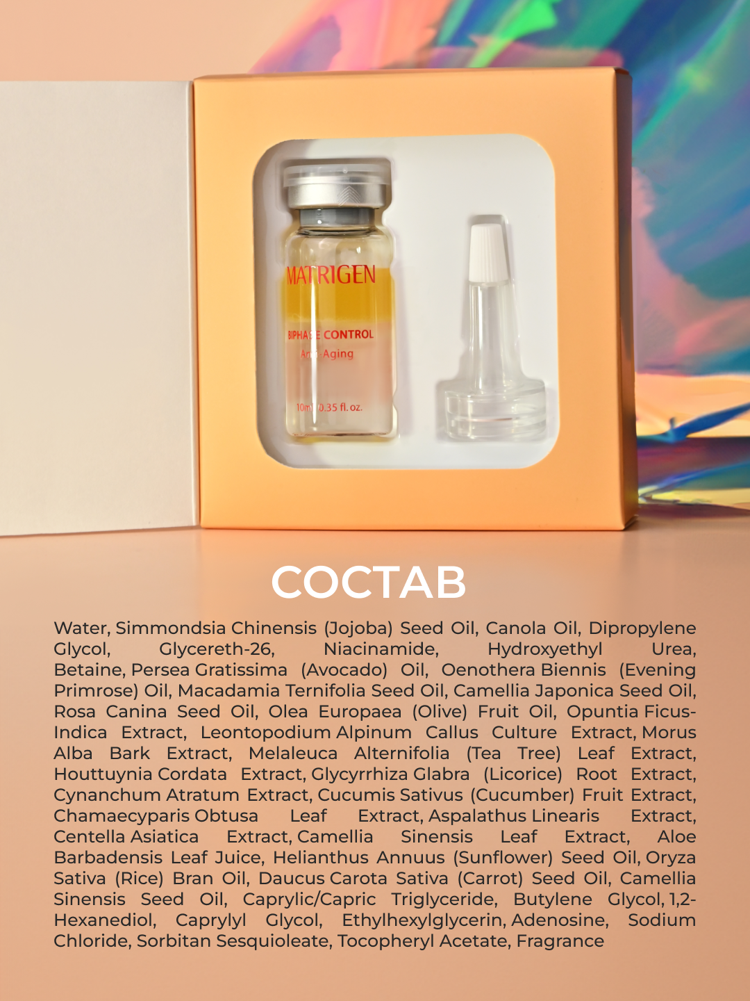 Matrigen Bi Phase control ampoules идеально подходит для всех типов кожи и является хорошим решением для интенсивного увлажнения, эластичности, регенерации и предотвращения старения кожи. Эффективный, не вызывающий раздражения растительный экстракт и различные ароматические ингредиенты создают связь между тканями кожи, делая кожу оживленной и упругой.