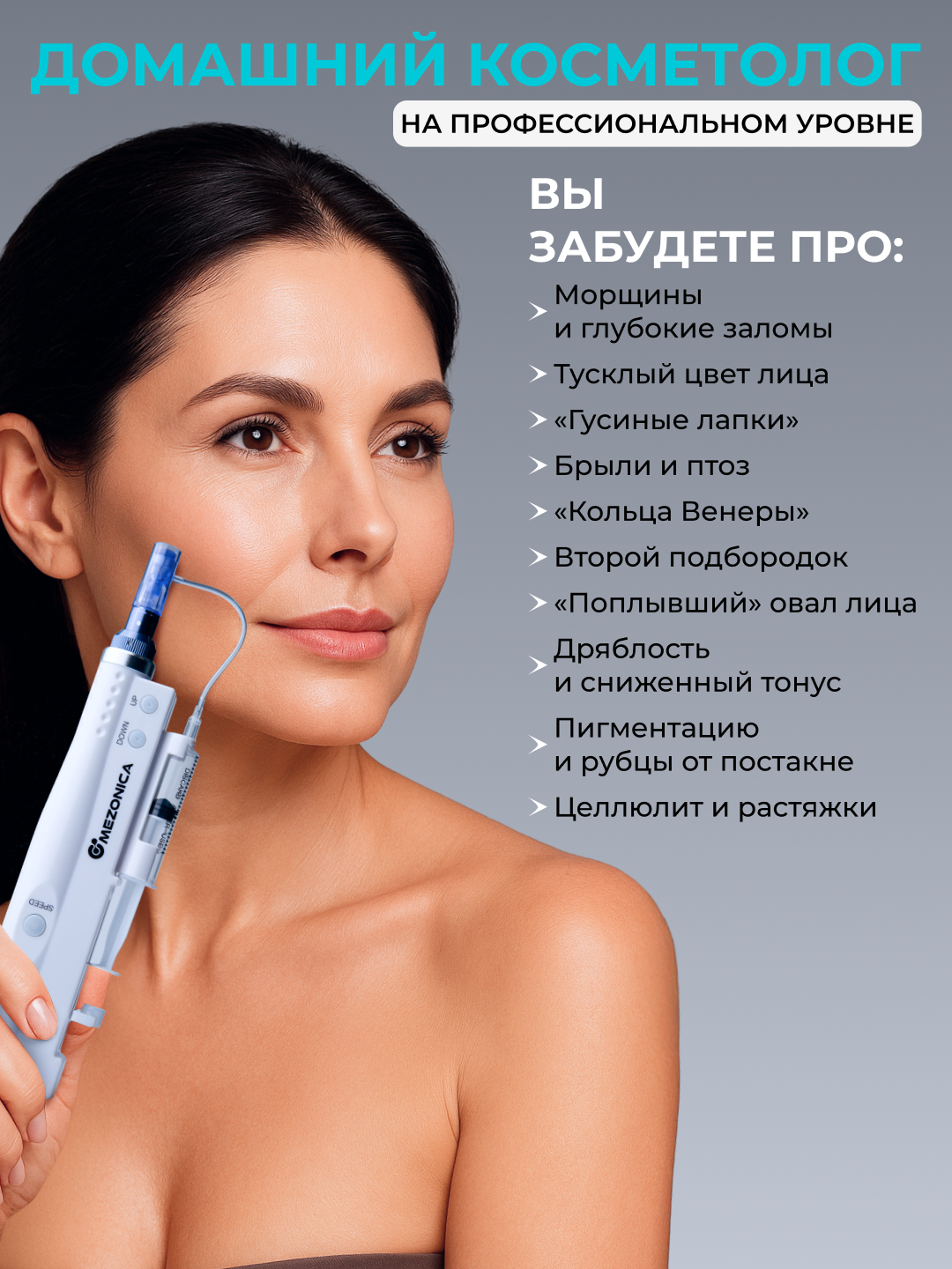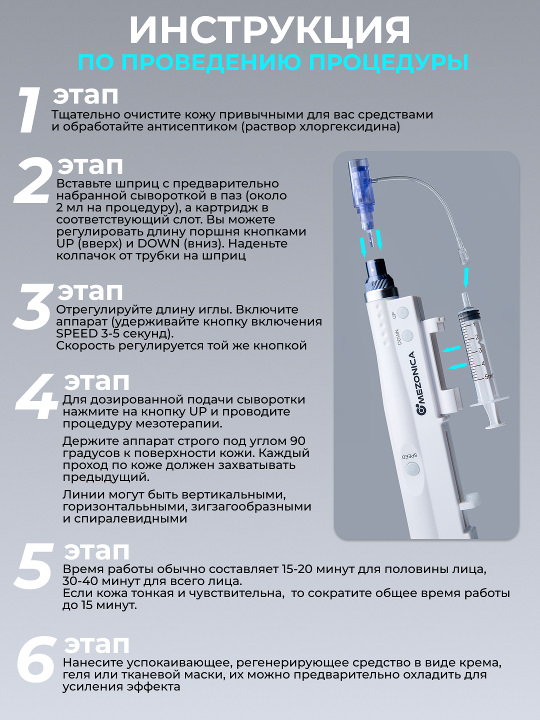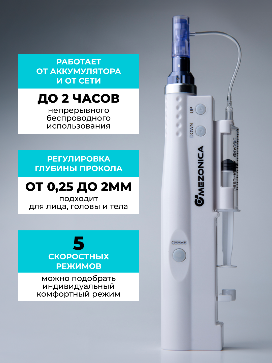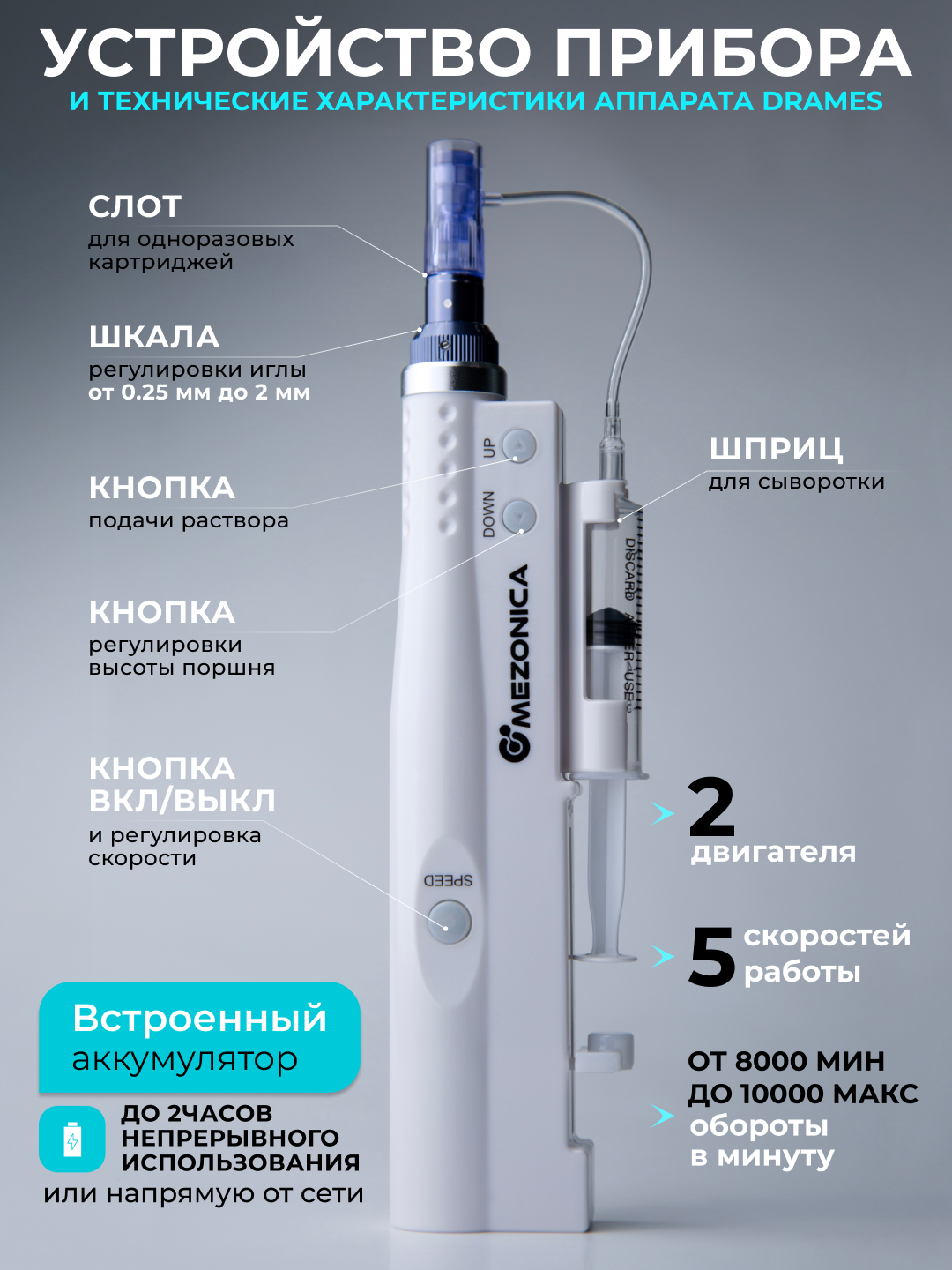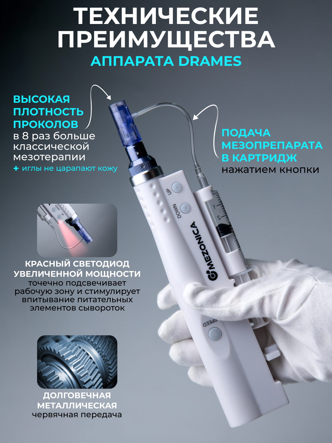 В корпусе аппарата расположены два двигателя и мощный аккумулятор. Один заведует обратно поступательным механизмом и обеспечивает полноценную амплитуду. Второй управляет червячной передачей, обеспечивая движение давящего элемента на шток поршня ёмкости, закрепленной на корпусе. По трубочке мезо сыворотка дозированно поступает в картридж.Преимущества модели