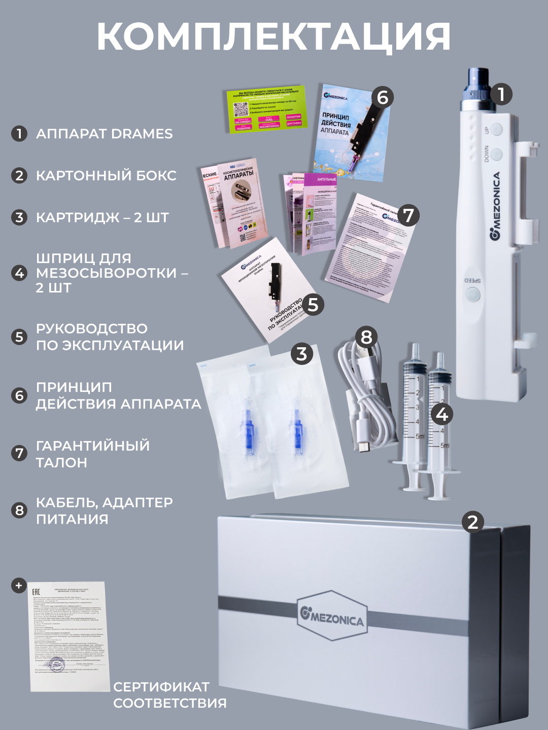 В комплекте с аппаратом идут 2 нано картриджа и Адаптер питания US Type A.