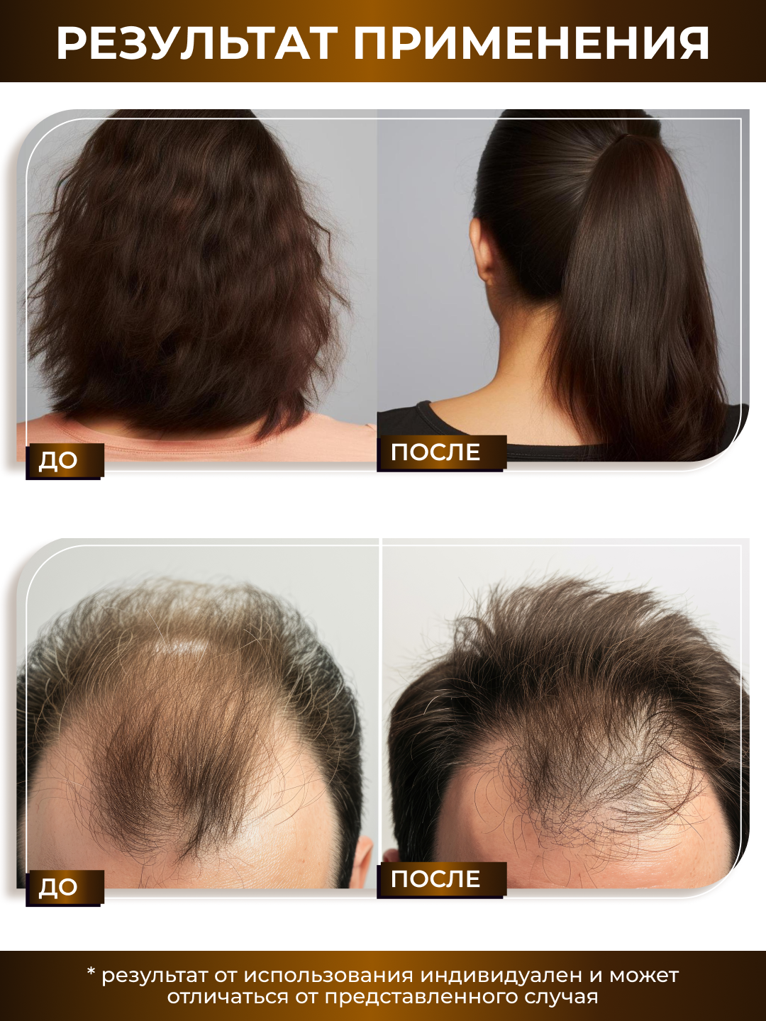 - Специализированные пептиды для волос (Nonapeptide-1, Hexapeptide-9) в сочетании с экстрактом софоры и пажитника укрепляют фолликулы, продлевают фазу активного роста (анагена) и эффективно сокращают потерю волос.