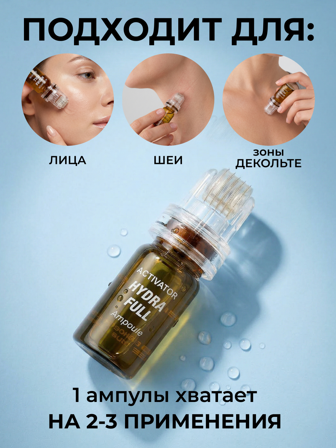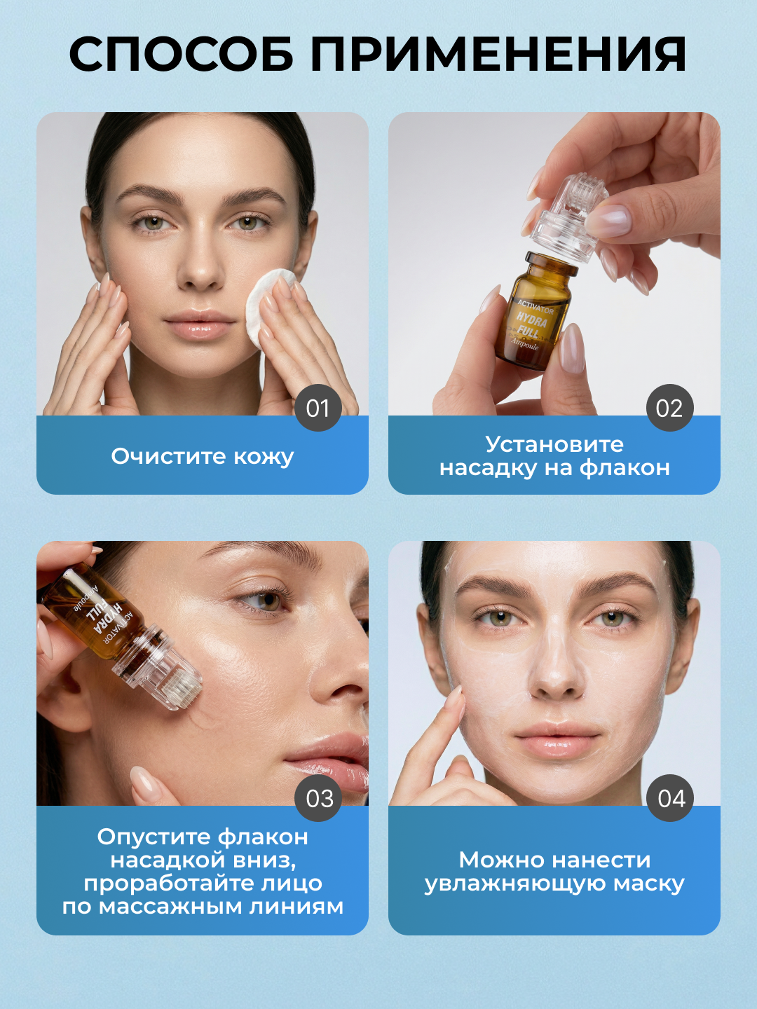 1. очистите лицо2. встряхните ампулу, снимите серебряную крышку и наденьте насадку сверху