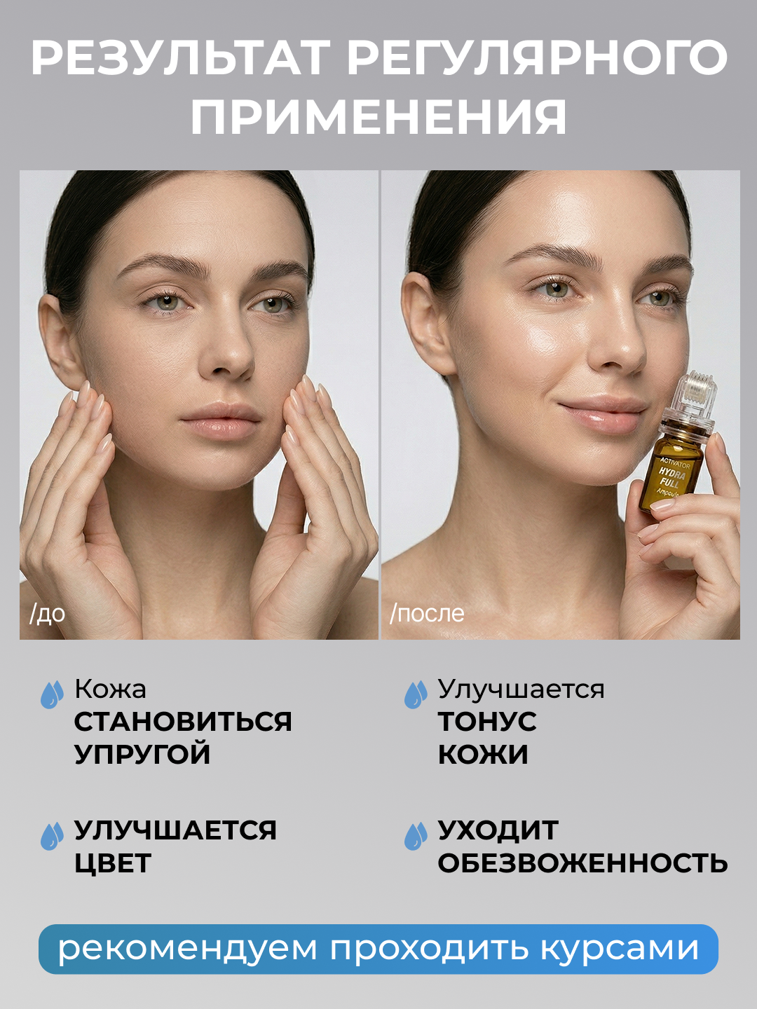 Рекомендуемая частота использования: с насадкой - 1 раз в неделю; без неё, как дополнение к сеансам микронидлинга, сыворотку можно использовать ежедневно.