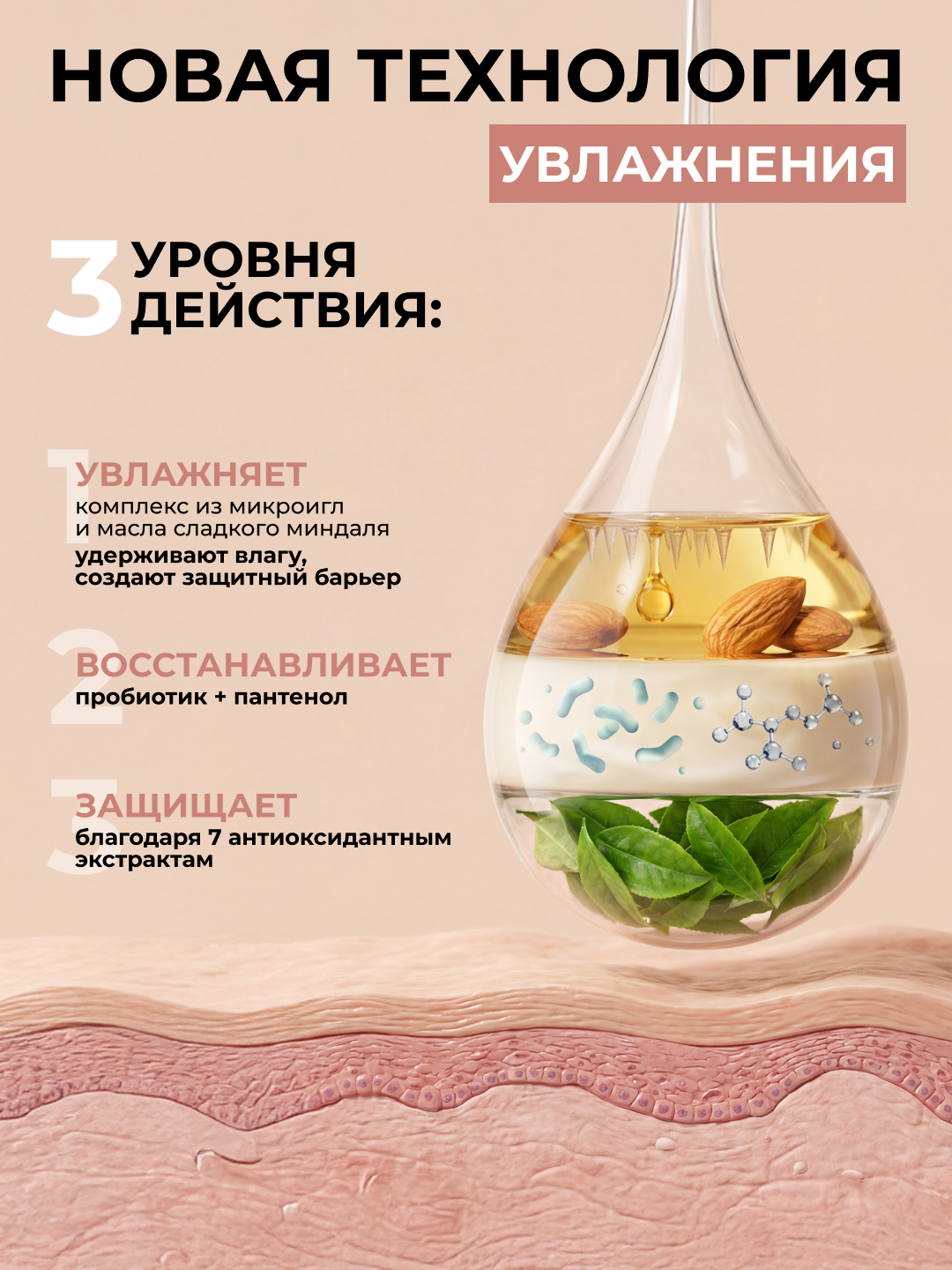 - Глубокое увлажнение: увлажняющие компоненты сохраняют кожу мягкой и увлажненной.